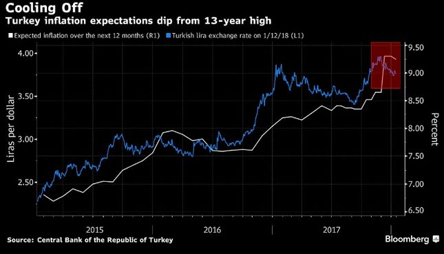 TCMB'nin yaptığı ankete göre, Türkiye'de ileriye yönelik enflasyon beklentileri, liranın dolar karşısında toparlanmasıyla birlikte dört ay içerisinde ilk kez düştü.