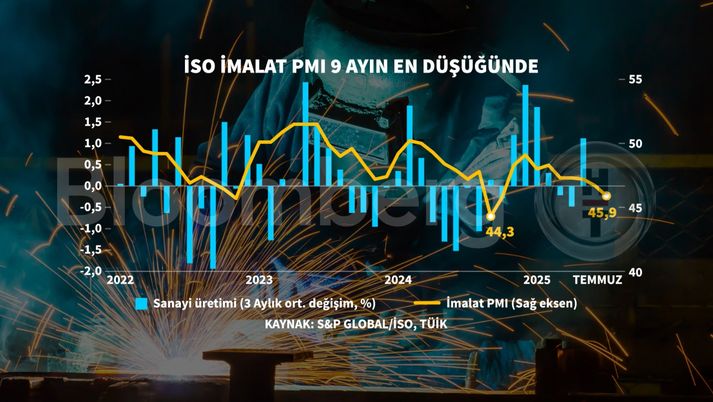 İstanbul Sanayi Odası Türkiye İmalat PMI Temmuz'da üst üste üçüncü ay gerileyerek 45,9 düzeyinde gerçekleşti.