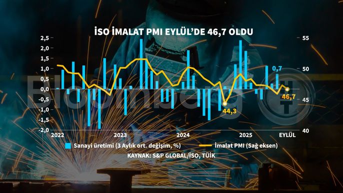 istanbul Sanayi Odası (İSO) Türkiye İmalat PMI Eylülde 46,7'ye gerileyerek imalat sektörünün yavaşlamaya devam ettiğini gösterdi.