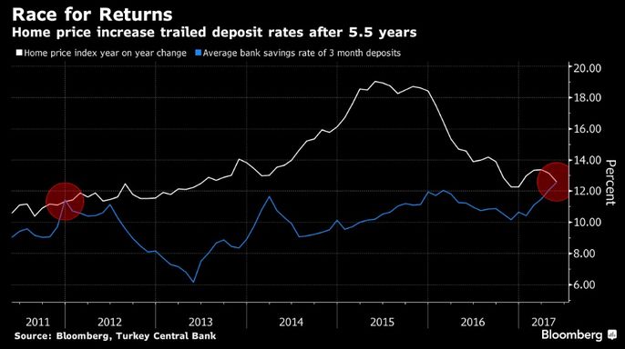 Türkiye'de konut fiyatları Mayıs ayında bir önceki yılın aynı dönemine göre yüzde 12.58 artarak, yüzde 12.73 seviyesindeki üç ay vadeli TL cinsi ortalama mevduat faizinden daha az getiri sağladı. Konut fiyatları, 2011 yılından bu yana ilk kez mevduat faizinin altında kaldı.