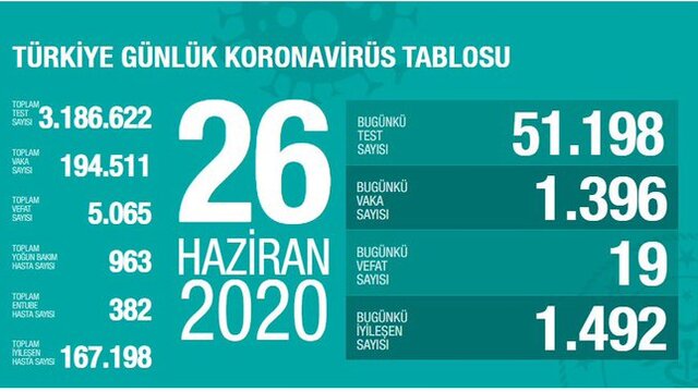 Sağlık Bakanlığının internet sitesinde yer alan ve Bakan Fahrettin Koca'nın Twitter'dan paylaştığı "Türkiye Günlük Koronavirüs Tablosu"nun güncel verilerine göre, bugün 51 bin 198 test yapıldı, 1396 kişiye Kovid-19 tanısı konuldu. Son 24 saatte 19 hasta vefat etti, 1492 kişi iyileşti.