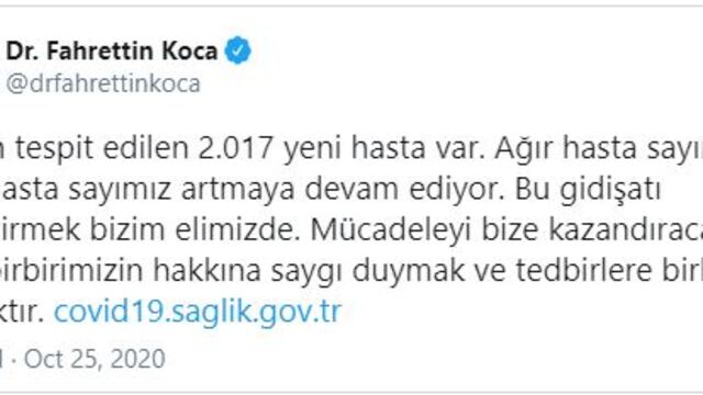Sağlık Bakanı Fahrettin Koca, verilere ilişkin Twitter hesabından yaptığı paylaşımda, şu ifadeleri kullandı: