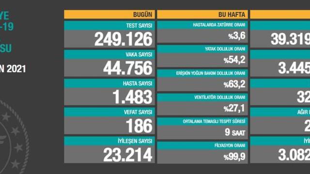 Sağlık Bakanlığı verilerine göre Türkiye'de son 24 saatte 249 bin 126 Kovid-19 testi yapıldı, 44 bin 756 kişinin testi pozitif çıktı, 186 kişi hayatını kaybetti.