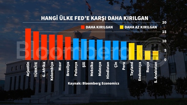 Bloomberg Economics’in çalışmasına göre, Arjantin Fed’in faiz artırımlarına karşı en kırılgan ülke konumunda bulunurken Türkiye ikinci sırada yer alıyor. Arjantin ve Türkiye’nin ardından en fazla risk altında bulunan diğer ülkeler ise Güney Afrika, Kolombiya, Mısır ve Brezilya.