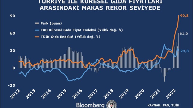 Küresel gıda enflasyonu ile Türkiye'de yaşanan gıda enflasyonu karşılaştırıldığında, Türkiye aleyhine makasın rekor seviyeye çıktığı görüldü.