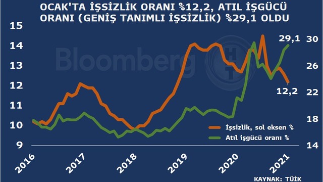 Aylık olarak yayımlanan verilerde atıl işgücü veri seti de yer aldı. Buna göre zamana bağlı eksik istihdam, potansiyel işgücü ve işsizlerden oluşan atıl işgücü oranı 2021 yılı Ocak ayında bir önceki aya göre 0,7 puan artarak yüzde 29,1 oldu.