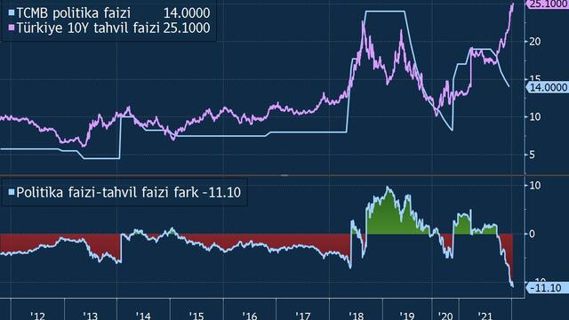 Türkiye’nin 10 yıllık Hazine tahvilinin faizi ihraç edilmeye başlandığından bu yana ilk defa yüzde 25’i geçerek rekor tazeledi. Böylece politika faizi ile 10 yıllık tahvil faizi arasındaki fark 11 puana kadar çıktı.