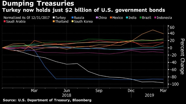 Türkiye ABD hazine tahvili portföyünün tamamına yakın kısmını elinden çıkartarak, çoğu gelişen piyasanın dahil olduğu, dünyanın en güvenli varlığını koruma ya da artırma yönündeki trendin karşısında yer aldı.