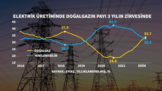 EPİAŞ'ın verileri kullanarak yapılan yıllıklandırılmış hesaplamaya göre, Türkiye'nin elektrik üretiminde doğalgazın payı 6 Ekim'de 3 yılın zirvesine çıktı.