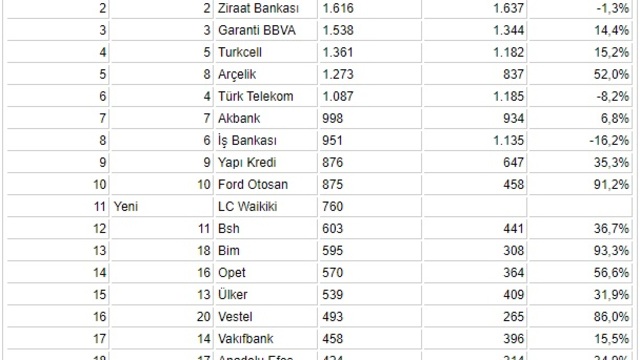 Listede üçüncü sırayı 1 milyar 538 milyon dolarlık marka değeriyle Garanti Bankası alırken, Turkcell 1 milyar 361 milyon dolarla 5'inci sıradan 4'üncü sıraya, Arçelik ise 1 milyar 273 milyon dolarla 8'inci sıradan 5'inci sıraya yükseldi.