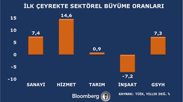 Buna göre yılın ilk çeyreğinde sanayi bir önceki yılın aynı dönemine göre yüzde 7,4 büyüdü. Hizmetler sektöründe büyüme ise yüzde 14,9 olarak kaydedildi.
