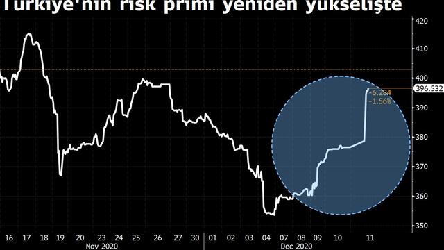 Türkiye'nin 5 yıl vadeli kredi temerrüt takas (CDS) primi 26 baz puan artarak 399 baz puan ile 28 Ekim'den bu yana en yüksek seviyeye çıktı.