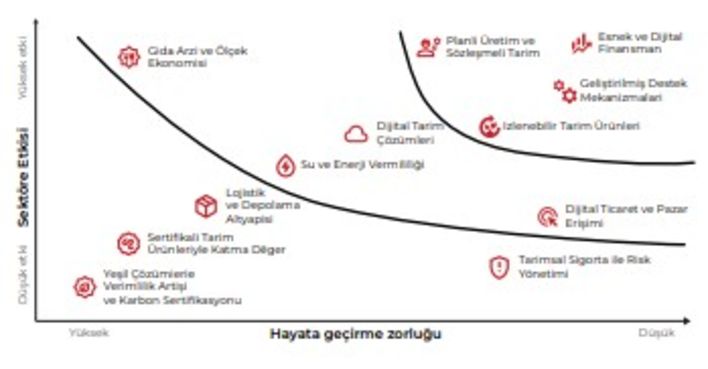 Bloomberg Sürdürülebilir Tarım ve Gıda oturumlarında alınan uzman geri bildirimleriyle, 12 stratejik çözüm önerisini “sektöre toplam etkisi” ve “hayata geçirme kolaylığı” boyutlarında konumlandıran iki eksenli bir önceliklendirme matrisi oluşturduk. Bu görsel yöntem, hangi başlıkların en yüksek etki–uygulanabilirlik kesişiminde yer aldığını netleştirerek karar vericilere odaklanılacak alanları somut biçimde göstermektedir. Vurgulanması gereken bir nokta, belirtilen 12 stratejik çözüm önerisinin tümünün dikkate değer olduğudur. Her ne kadar bazıları kısa vadede uygulanmayıp, düşük öncelikte yer alsa da uzun vadede bu çözüm önerilerinin hepsinin hayata geçirilmesi gerekmektedir.