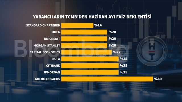 Son dönemde müşterileriyle analizlerini paylaşan yabancı kurumlar arasında yüzde 40'a varan faiz tahminleri yapıldı. Yabancılar arasında en temkinli tahmini yapan kurum yüzde 14 ile Standard Chartered oldu. En şahin beklentiyi ise yüzde 40 ile Goldman Sachs yapmıştı.