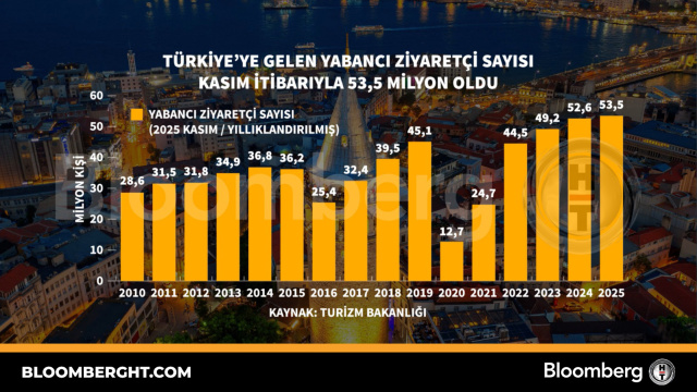 Bloomberg HTGrafikTürkiye'ye gelen yabancı ziyaretçi sayısı Kasım itibarıyla 53,5 milyon oldu