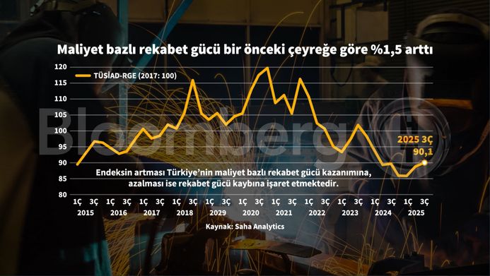 TÜSİAD Maliyet Bazlı Rekabet Gücü Endeksi (TÜSİAD-RGE), 2025 yılının üçüncü çeyreğinde bir önceki çeyreğe göre yüzde 1,5 oranında yükselerek 90,1 değerini alırken yıllık yüzde 0,3 düşüş kaydetti.