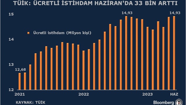 Buna göre, sanayi, inşaat ve ticaret-hizmet sektörleri toplamında ücretli çalışan sayısı 2023 Haziran ayında bir önceki yılın aynı ayına göre yüzde 2,2 arttı. Ücretli çalışan sayısı bir önceki yılın aynı ayında 14 milyon 611 bin 38 kişi iken, 2023 yılı Haziran ayında 14 milyon 925 bin 783 kişi oldu.