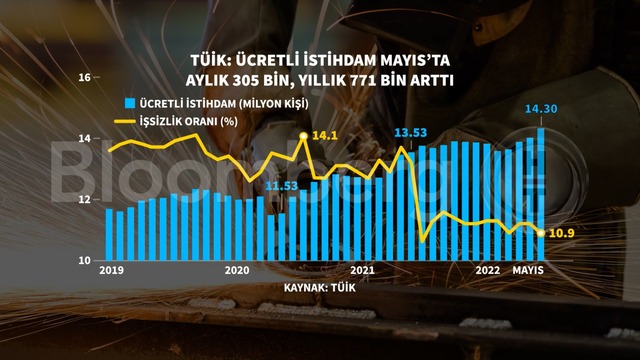 Ücretli çalışan sayısı bir önceki yılın aynı ayında 13 milyon 529 bin 149 kişi iken, 2022 yılı Mayıs ayında 14 milyon 299 bin 713 kişi oldu.