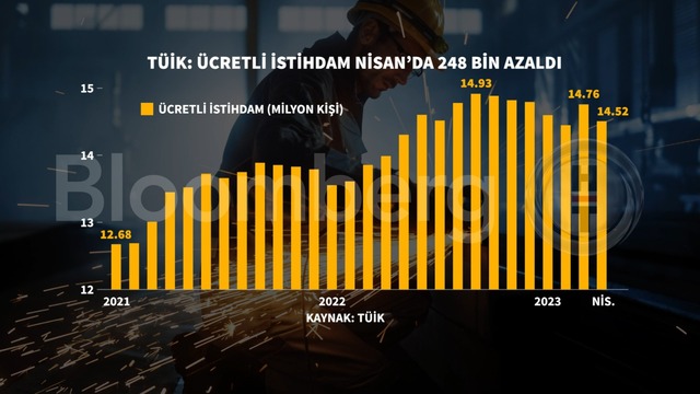 Sanayi, inşaat ve ticaret-hizmet sektörleri toplamında mevsim etkilerinden arındırılmış ücretli çalışan sayısı Nisan'da bir önceki aya göre yüzde 1 geriledi.