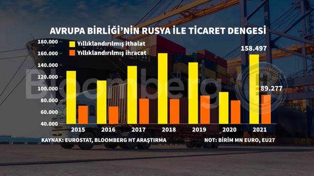 İkili ticaretinden son 6 yıllık rakamlara baktığımızda nette kazançlı olan Rusya olarak karşımıza çıkıyor. 2021 yılınında AB Rusya’ya yıllıklandırılmış ithalatı 158.5 milyar euro olurken, aynı