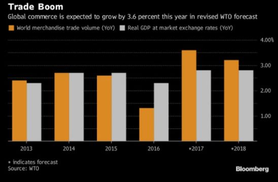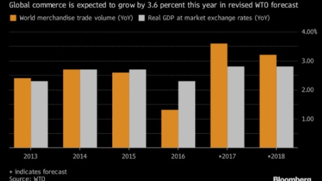 Dünya Ticaret Örgütü (WTO), 2017 için küresel ticaret hacmi büyüme tahminini, bir önceki seviyesi olan yüzde 2.4'ten yüzde 3.6'ya yükseltti. Yapılan bu yukarı yönlü revizenin, ABD ve Asya'da 2017'nin ilk yarısında gerçekleşen akışlardaki "şiddetli hızlanma" sebebiyle olduğu bildirildi.