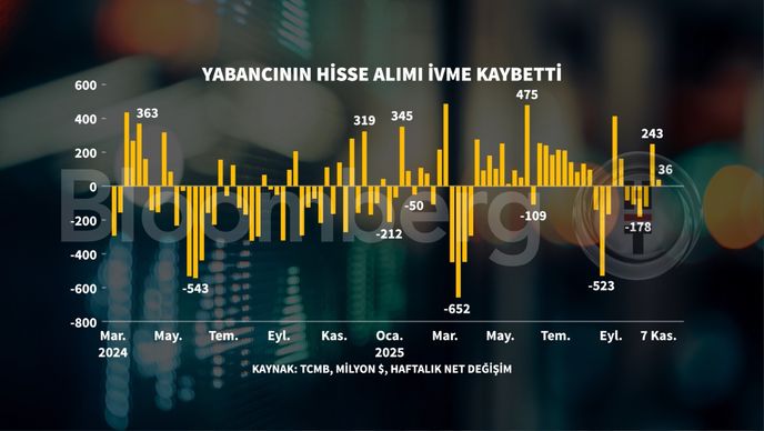 Türkiye Cumhuriyet Merkez Bankası (TCMB) verilerine göre 7 Kasım haftasında yurt dışı yerleşiklerin hissede 36 milyon dolarlık net alım yaptığı görüldü. Bir önceki hafta da yabancı yatırımcılar 243 milyon dolarlık alım yapmıştı.