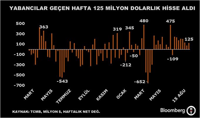• 15 Ağustos haftasında 125 milyon dolarlık hisse alan yabancı yatırımcı tahvilde ise 1 milyar doları aşan giriş yaptı.