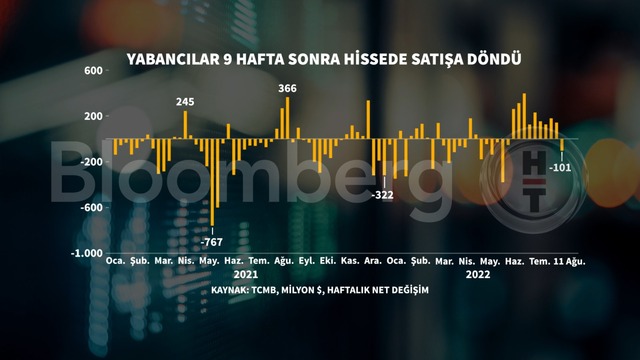 TCMB tarafından yayımlanan verilere göre yabancı yatırımcı 11 Ağustos haftasında 101 milyon dolarlık net hisse satışı gerçekleştirdi. Böylelikle 9 haftalık alım serisi sona ermiş oldu.