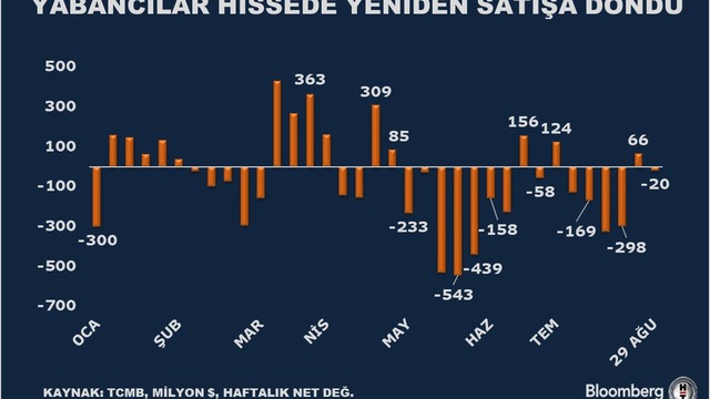 • Yabancı yatırımcı 29 Ağustos haftasında hissede satışa tahvilde alışa döndü. Geçen hafta 19,5 milyon dolarlık hisse satan yurt dışı yerleşikler aynı hafta 683 milyon dolarlık tahvil aldı.