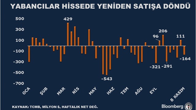 Türkiye Cumhuriyet Merkez Bankası (TCMB) tarafından açıklanan verilere göre, yabancı yatırımcı 8 Kasım haftasında 163,8 milyon dolarlık hisse sattı.
