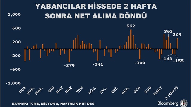 Yurt dışında yerleşik kişiler piyasa fiyatı ve kur hareketlerinden arındırılmış verilerle 3 Mayıs haftasında 309 milyon dolar dolarlık hisse aldı.