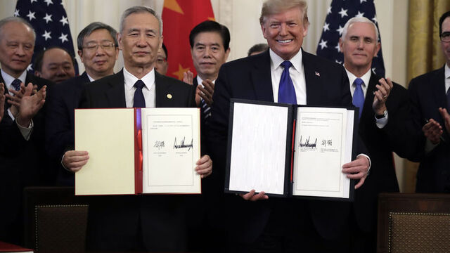 ABD Başkanı Donald Trump ve Çin Başbakan Yardımcısı Liu He neredeyse iki yıldan daha fazla bir süredir tarafların birbirlerine ek gümrük vergileri uyguladığı ticaret savaşının ardından Çarşamba günü Washington’da ticaret anlaşmasını imzaladı.