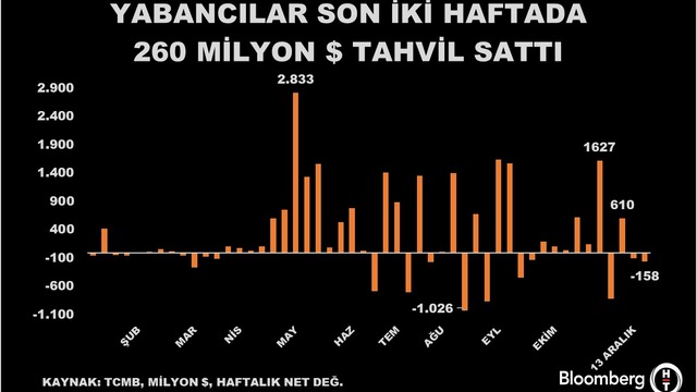 Buna göre, yurt dışında yerleşik kişiler, 13 Aralık haftasında net 318,7 milyon dolarlık hisse senedi alırken, 243 milyon dolarlık Devlet İç Borçlanma Senedi (DİBS) ve 1,5 milyon dolarlık Genel Yönetim Dışındaki Sektör (ÖST) varlığı sattı.