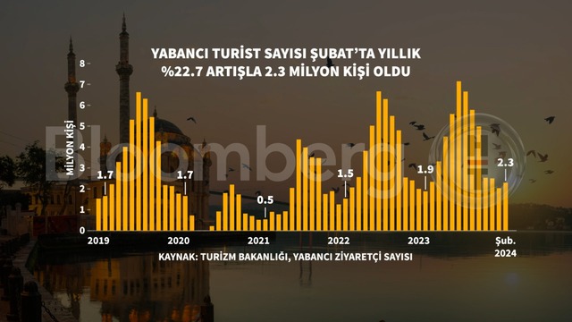 • Kültür ve Turizm Bakanlığının verilerine göre Şubat ayında ise Türkiye'yi 2 milyon 294 bin 579 yabancı ziyaret etti. Turizmdeki Şubat ayı artış oranı da bir önceki yılın aynı ayına göre yüzde 22,68 oldu.