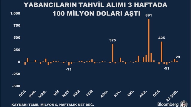 • Yurt dışında yerleşik kişilerin altı hafta sonra geçen hafta döndüğü satış, bu hafta da sürerken tahvil alımı üç haftada 100 milyon doları aştı. Önceki hafta 22,1 milyon dolarlık hisse satan yabancının 23 Şubat haftasında yaptığı hisse satışı ise 98 milyon dolar oldu.