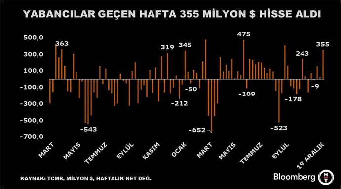 Yabancı yatırımcı 19 Aralık haftası hisse alımını 354,5 milyon dolara çıkardı.