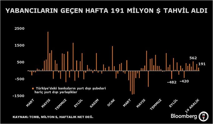 Türkiye Cumhuriyet Merkez Bankası (TCMB) tarafından yayımlanan "Haftalık Menkul Kıymet İstatistikleri"ne göre, yurt dışında yerleşik kişiler, 19 Aralık haftasında haftasında 2345,5 milyon dolarlık hisse aldı.