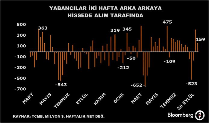 Türkiye Cumhuriyet Merkez Bankası (TCMB) verilerine göre, 26 Eylül haftasında yurt dışı yerleşikler 158,8 milyon dolarlık net hisse alımı gerçekleştirdi.