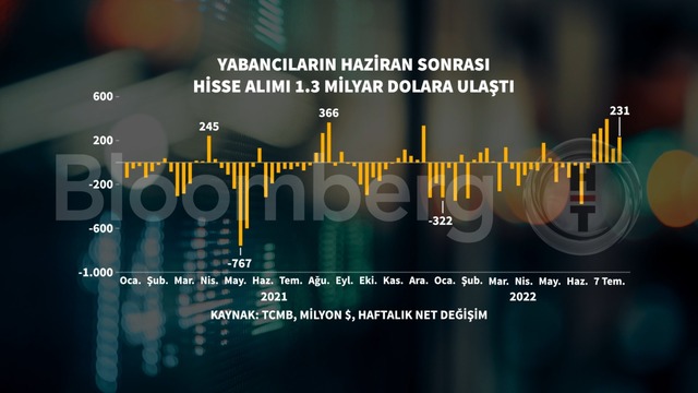 TCMB'nin verilerine göre yabancılar hissede alım serisini beşinci haftaya taşıdı. Yabancı yatırımcı 7 Temmuz haftasında 231 milyon dolarlık hisse alırken seçimden bu yana net hisse alım miktarı 1,3 milyar dolara yaklaştı.