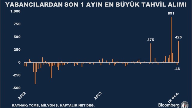 Türkiye Cumhuriyet Merkez Bankası (TCMB) verilerine göre, yabancı yatırımcıların tahvilde net alımı 12 Ocak haftasında 425 milyon dolar olarak gerçekleşti. Böylelikle 8 Aralık haftasından bu yana en yüklü yabancı girişi görüldü.