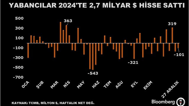 Yurt dışı yerleşikler yılın son haftasında hem hisse hem de tahvil satışı yaptı. Yıl boyunca yabancının sattığı hisse büyüklüğü 2,7 milyar dolar seviyesinde oldu.