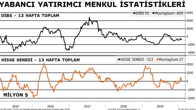 Buna göre, yurt dışında yerleşik kişiler, 31 Ocak haftasında net 313,3 milyon dolarlık hisse senedi ve 12 milyon dolarlık Şirket Borçlanma Senetleri (ŞBS) sattı, 51,1 milyon dolarlık Devlet İç Borçlanma Senedi aldı.