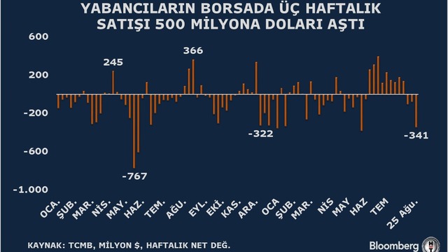 TCMB tarafından yayımlanan menkul kıymet istatistiklerine göre yurt dışı yerleşik kişiler 25 Ağustos haftasında 341,1 milyon dolarlık hisse sattı. Böylece yabancıların 3 haftalık net hisse satışı yarım milyar doları aştı.