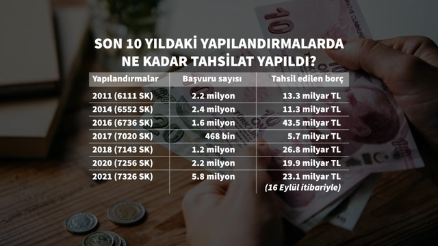 Hazine ve Maliye Bakanlığı verilerine göre, yapılandırma için 5 milyon 804 bin mükellef vergi dairelerine başvurdu. 152,6 milyar lira alacak yapılandırıldı. Kanun kapsamında bugüne kadar 23 milyar lira tahsilat yapıldı.