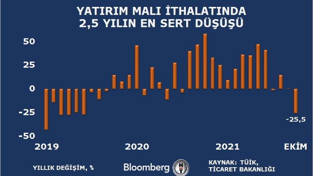 Ticaret Bakanlığı'nın açıkladığı öncü verilere göre Türkiye'de yatırım malı ithalatı Ekim'de bir önceki yılın aynı dönemine göre yüzde 25,5 düşüş kaydetti. Böylelikle yatırım malı ithalatında 2,5 yılın en sert düşüşü kaydedildi.