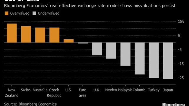 Bloomberg Economics tarafından oluşturulan reel efektif kur modeline göre, Türkiye, Meksika, Malezya, Japonya ve Kolombiya para birimlerinin değeri az fiyatlanırken Çekya, Yeni Zelanda, Avustralya ve İsviçre para birimlerinin değeri fazla fiyatlanıyor.