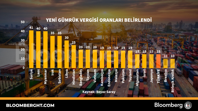 Bloomberg HT Grafik Yeni gümrük vergisi oranları belirlendi Yeni gümrük vergisi oranları belirlendi 01 Ağustos 2025, Cuma 12:20 Güncelleme : 01 Ağustos 2025, Cuma 12:20
