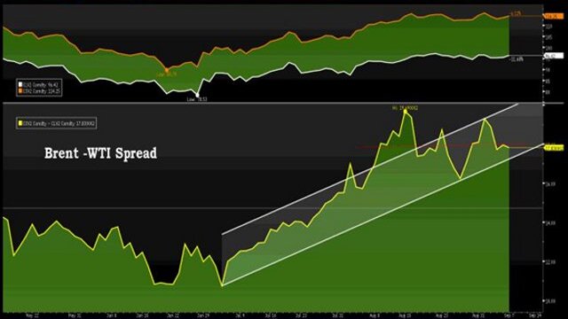 Nitekim yukarıdaki veri ve beklentiler grafiklere yansımaya başladı. Kasım vadeli Brent ve NYMEX WTI petrolünün fiyat ilişkisi (spread) zayıflama sinyali veriyor. 04 Eylül’de 18.47 dolar/varil’e kadar artan spread daralmaya başlarken yükselme kanal direncinin aşılamaması spreadin zayıflama, daralma işareti olarak görülebilir.