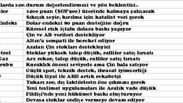 ABD’de uzun hafta sonu tatili sebebiyle kıymetli metaller olağandışı sakin bir süreç geçirdi. AB’den gelen veriler sonrası doların değer kaybetmesi (risk iştahının artması) ile birlikte altın fiyatı 1750 dolar, gümüş ise 34.0 dolar üzerinde son altı haftanın en yüksek değerine yükseldiler. Avrupa Birliği’nde Alman ekonomik verilerinin Kasım ayında iyileşmesi üzerine Troyka’nın Yunanistan’a yardım paketine ilişkin olumlu beklentiler arttı. Dolayısı ile değerli euro veya zayıf dolar ile kıymetli metaller destek buluyor. Bu hafta 1800 dolar psikolojik zirve öncesinde altın fiyatının önemli 1760 dolar direncini aşması gerekir. Yıl sonuna yaklaşırken yatırımcıların ilave riskler almasının zor olduğu ve sığ piyasa koşullarında altın fiyatının hızla yükseldiği düşünülürse, 1800 dolar öncesi kısa süreli ve cılız bir kar realizasyonu görmek şaşırtıcı olmaz.