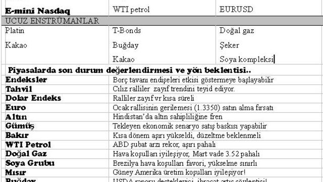 S&P 500 yılbaşından bu yana % 10 üzerinde artarak 2013 yılına çoşku ile başladı. Bu hali ile birçok gösterge mükemmelliği satın almış görünüyor ve dolayısıyla piyasanın ciddi bir düzeltme için olgunlaştığı söylenebilir. 2013 coşkusu ardında, ABD ekonomik verileri, AB’den gelen olumsuz verilerin azalması ve Çin’in büyüme yönünde çabaları gösterilebilir. Ancak, son günlerdeki ekonomik verilerde bazı endişeler öne çıkabilir. Örneğin, ABD son çeyrek büyüme (GDP) rakamlarındaki daralma kısa süreli de olsa iyimserliğe gölge düşürebilir. Avrupa Birliği’nde geçen hafta Merkez Bankası Başkanının açıklamaları ile bir adım geri atıldı. Draghi, daha temkinli olunması, aşırı yükselen euro/dolar paritesinin sürdürülebilir olmadığı türünden ifadesi bölgede endişelere yol açabilir.